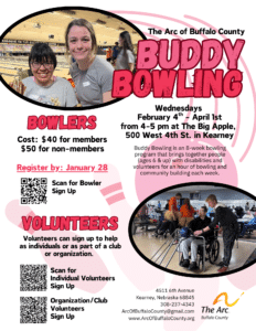 Buddy Bowling is an 8-week bowling program that brings together people (ages 6 & up) with developmental disabilities and volunteers from UNK, KHS, & the community. On the last day of Buddy Bowling, we will enjoy a food and awards celebration.